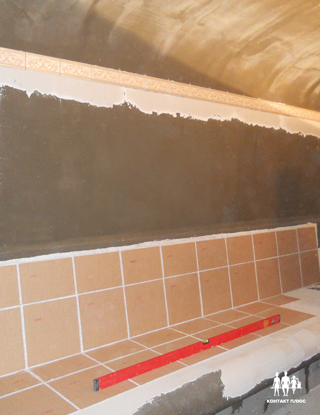 10. Замазываем полости адгезионной штукатуркой, так как поверхность панелей для хамама абсолютно ровная и сразу готова к приклеиваемую плитки — начинаем клеить плитку.