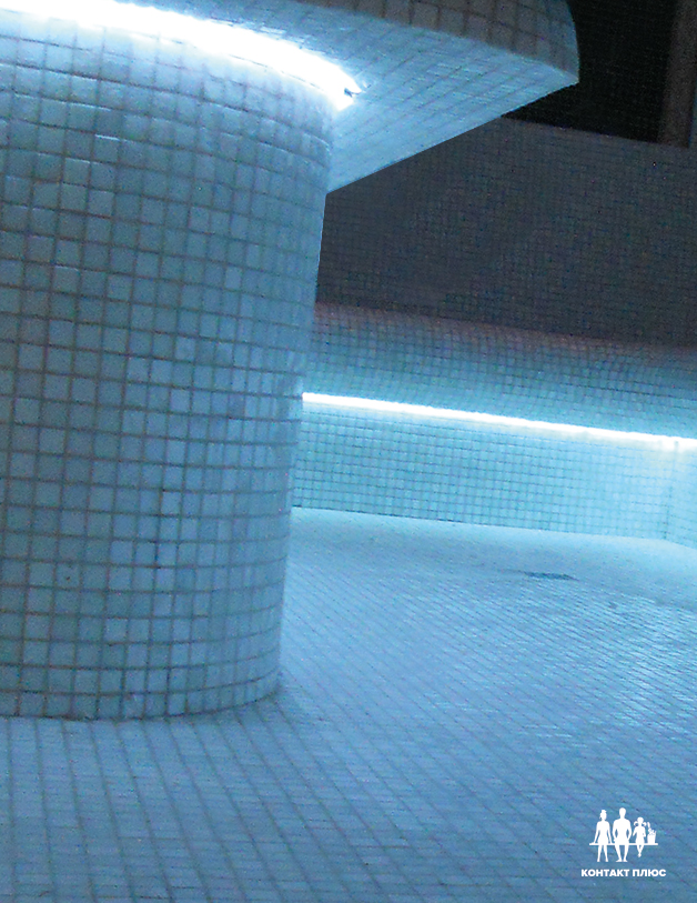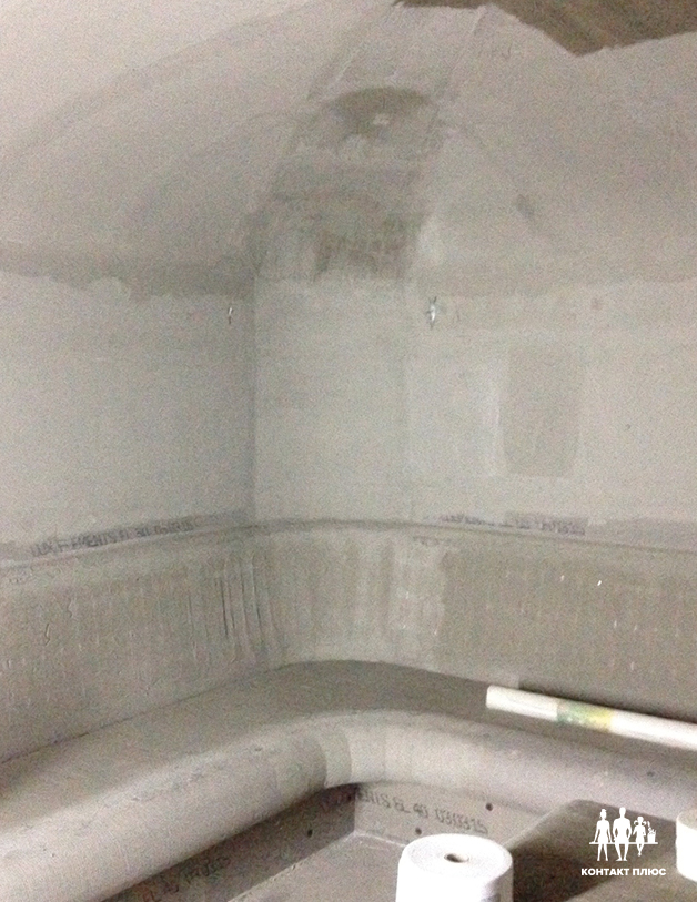 После этого окончательно выравнивается отверстие под сферу. Далее все армируется и гидроизолируется, как описано выше. Основной минус купола «Сфера» в том, что его спуск и переход в горизонтальный потолок происходит над лежаками. Соответственно конденсат может капать на отдыхающих