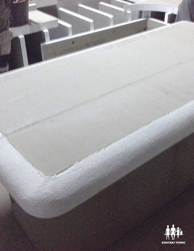 Купол мы изготавливаем из армированных панелей Делюкс или Теплофом. Они производятся из жесткого экструдированного полистирола, армированого с двух сторон стеклосеткой с гидроизоляционным полимерцементным покрытием. Либо из жестковспененного пенопласта марки ПСБ-50. Это вспененный пенополистирол (белый, шариками), самый плотный и жесткий из всех производимых (с армировкой или без).