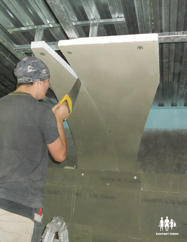 После того, как пено-клей высохнет купол необходимо поднять и закрепить у потолка (на время). После монтажа стеновых панелей (описание здесь) пено-клей для полистирола наносится на верхний торец стеновых панелей, а купол опускается на них и приклеивается.