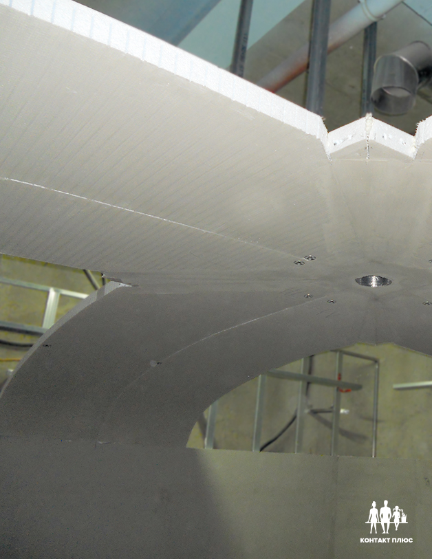 К стене нужно прикрепить треугольные конструкции, сделанные из направляющих. Купольная конструкция с панелями поднимается вверх и по всему периметру прикручивается саморезами с шайбами к этим треугольным направляющим — панели снизу, а треугольные конструкции сверху, спрятанные за потолком
