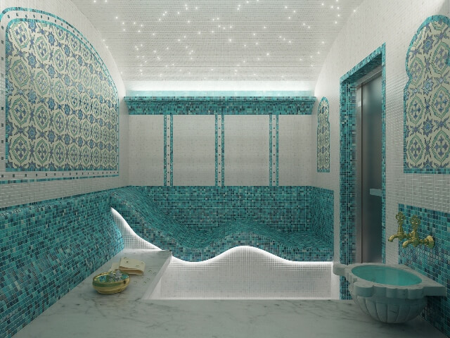 Турецкая баня отличается освещением. Оно формирует чувство экзотики и околдовывает, погружает помещение в атмосферу Востока.