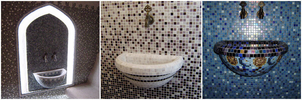 В хамаме обязательно наличие курны. Чаша для умывания выполняется в восточном стиле, дополняется двумя кранами, откуда будет бежать горячая и холодная вода.
